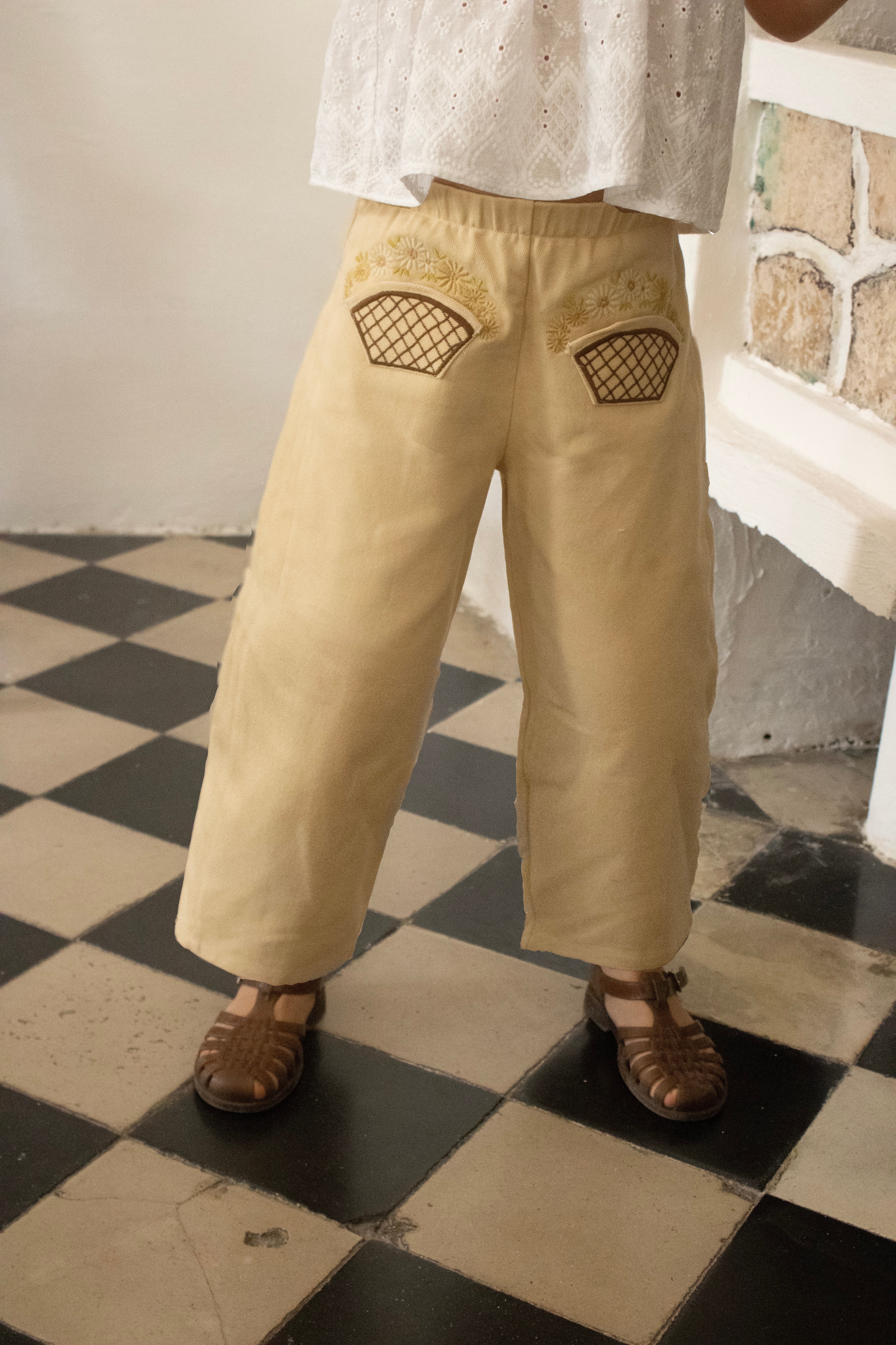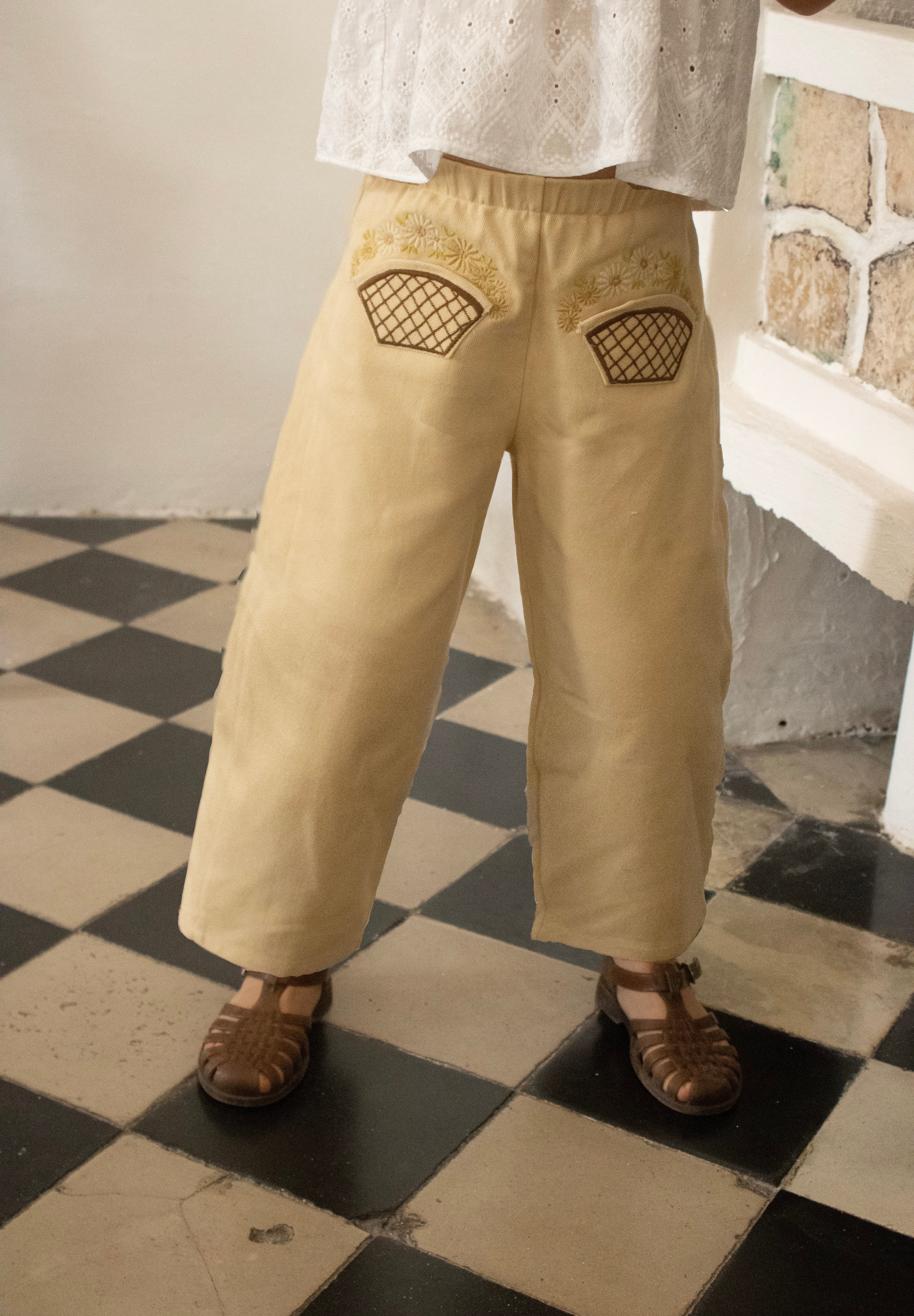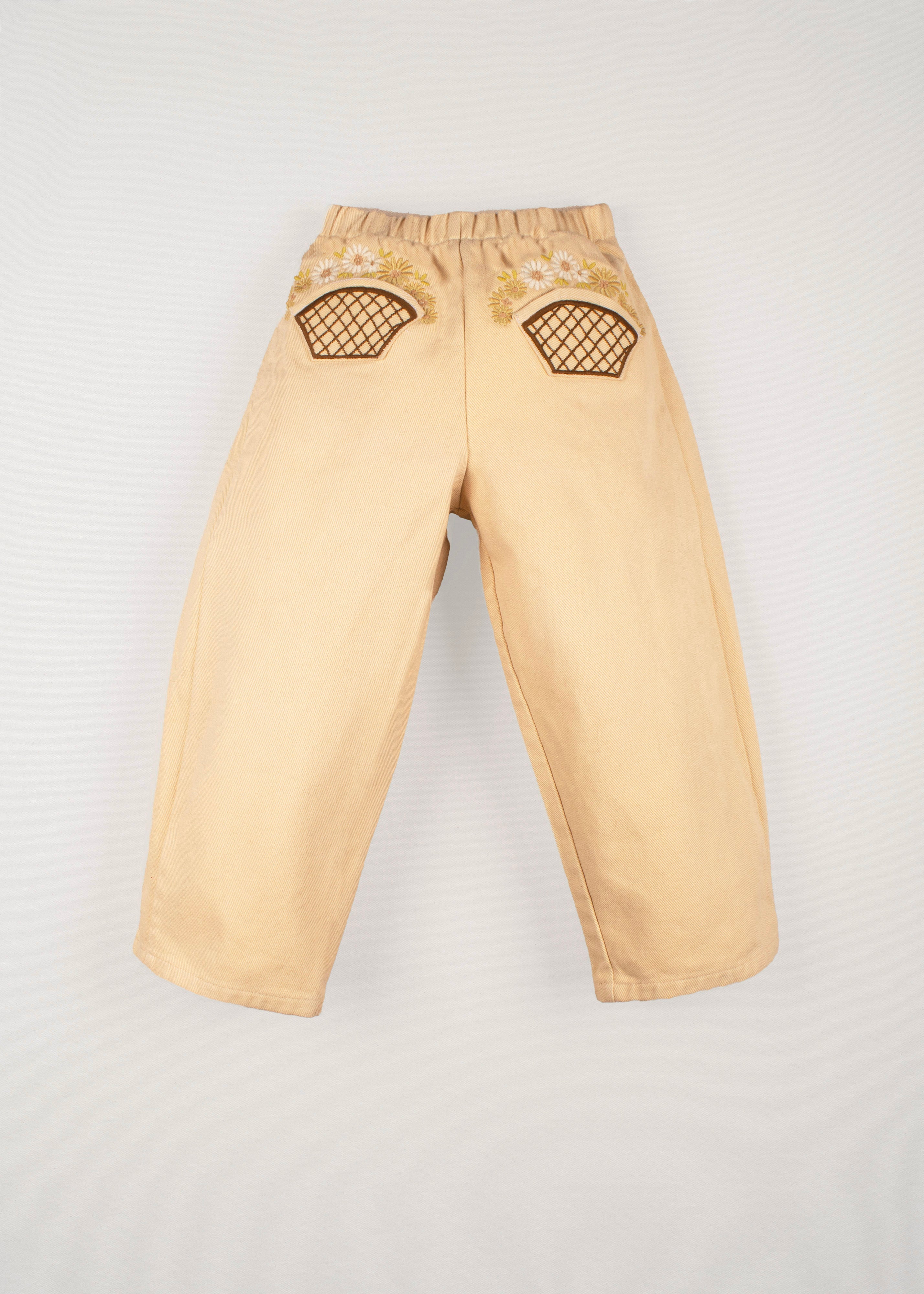 Delicate embroidery at the pockets forms tiny baskets brimming with flowers, an intricate detail that brings a quiet sense of craftsmanship to this everyday piece. The result is a pant that feels both playful and refined—an artisan touch for daily adventures.