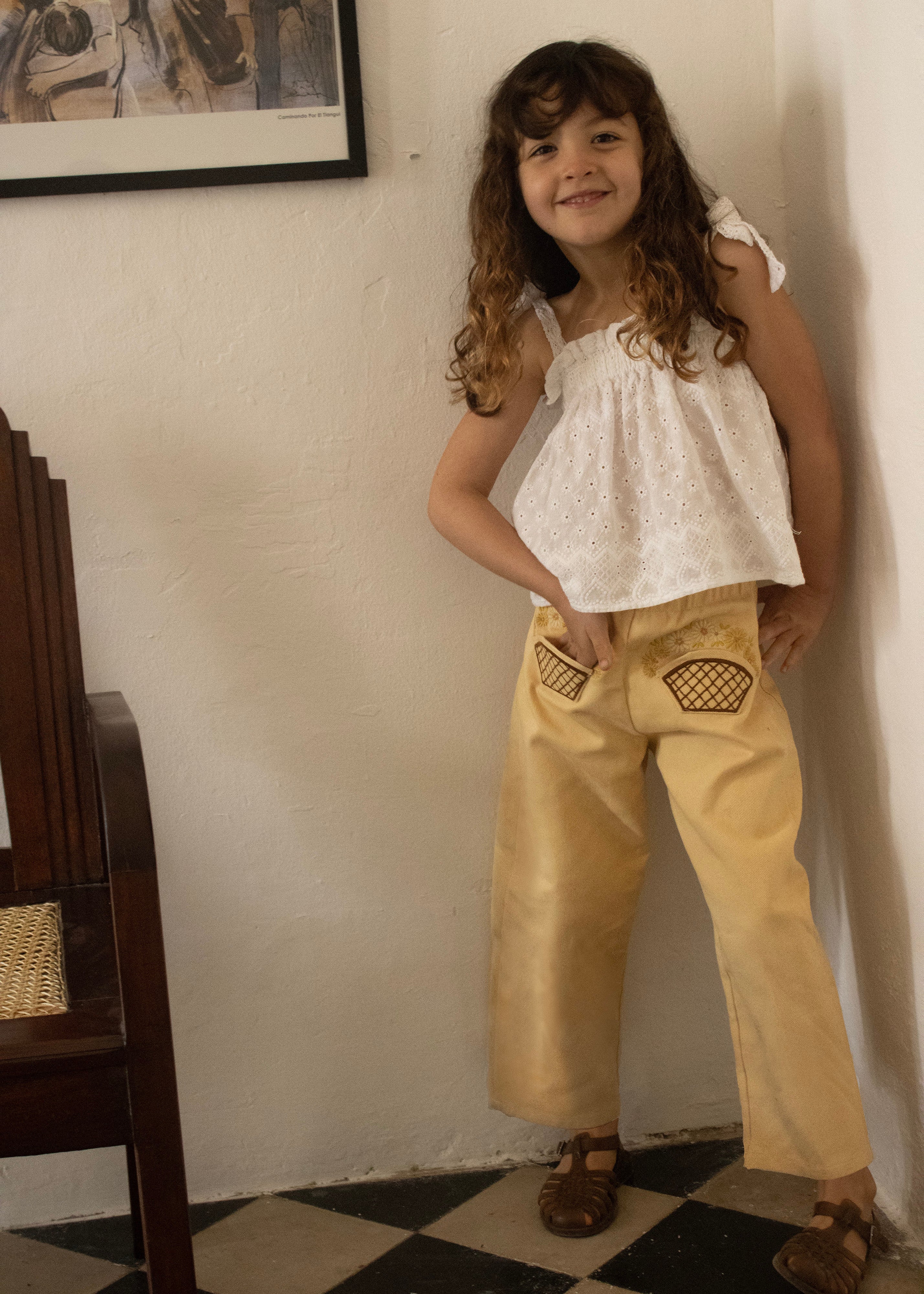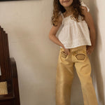 Cut in a roomy barrel-leg silhouette with a sculpted side panel, this effortless pant is designed to move beautifully with children throughout the day. For the season, the Paz is reimagined in a soft yellow washed cotton twill—sunlit, versatile, and easy to wear.