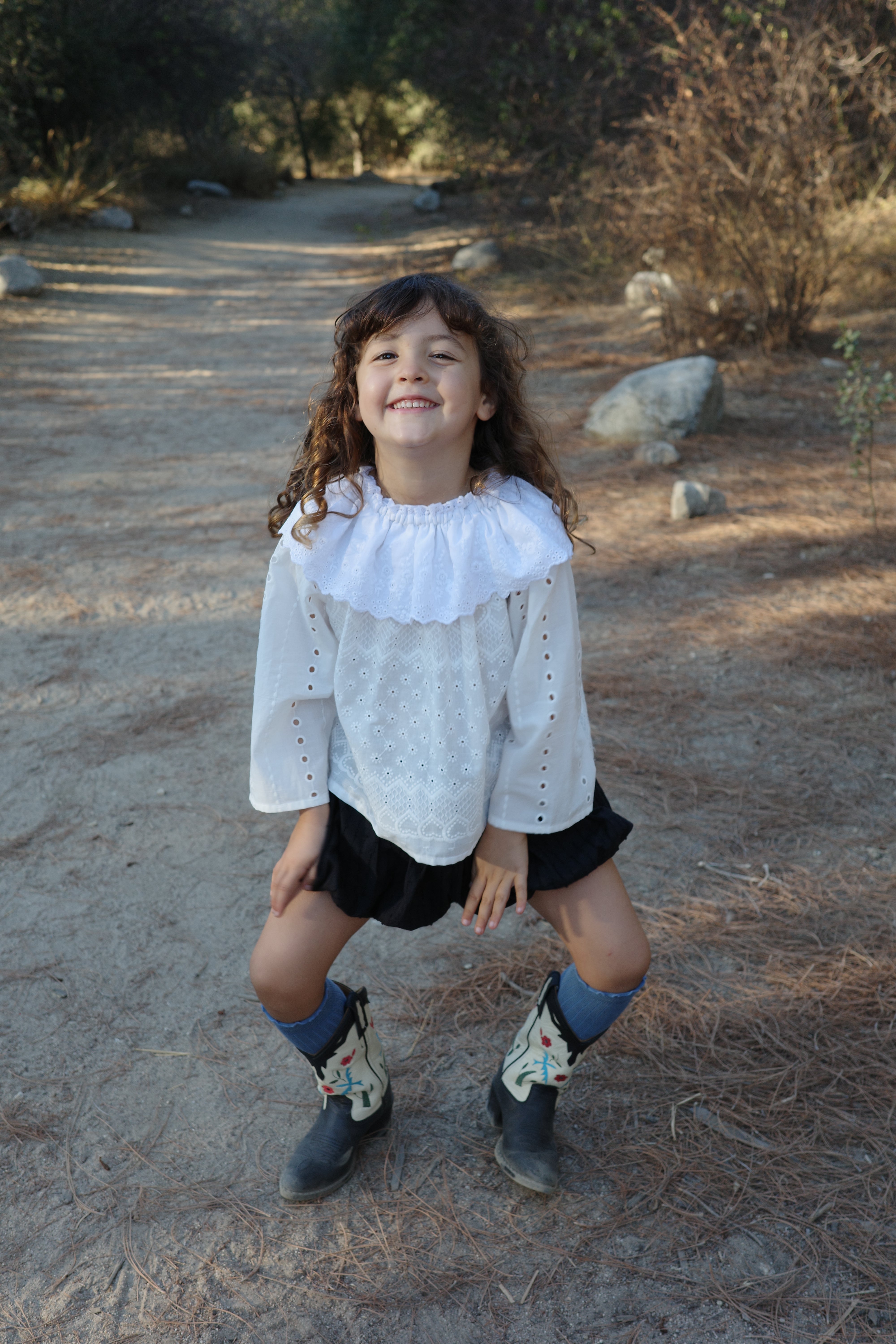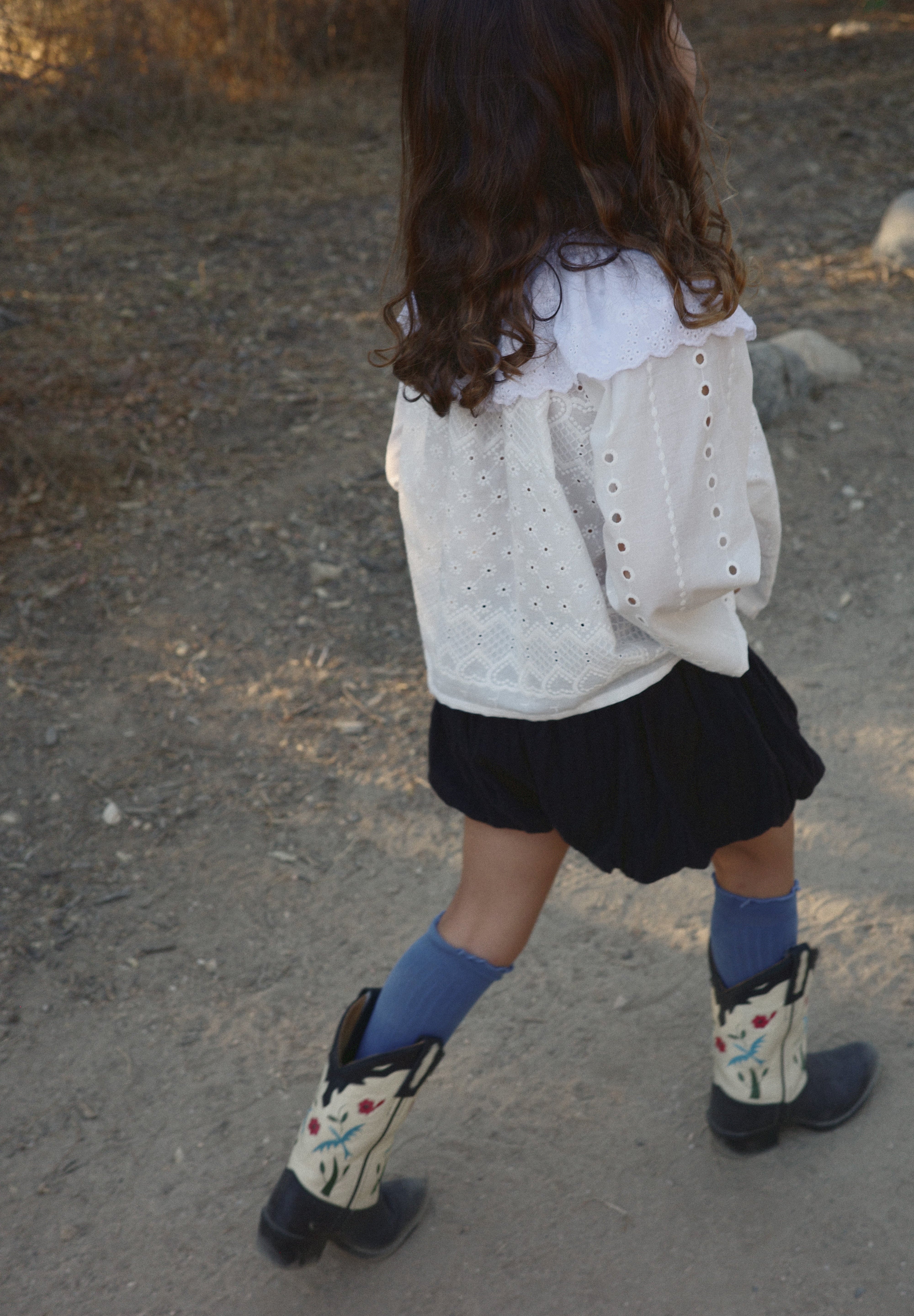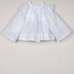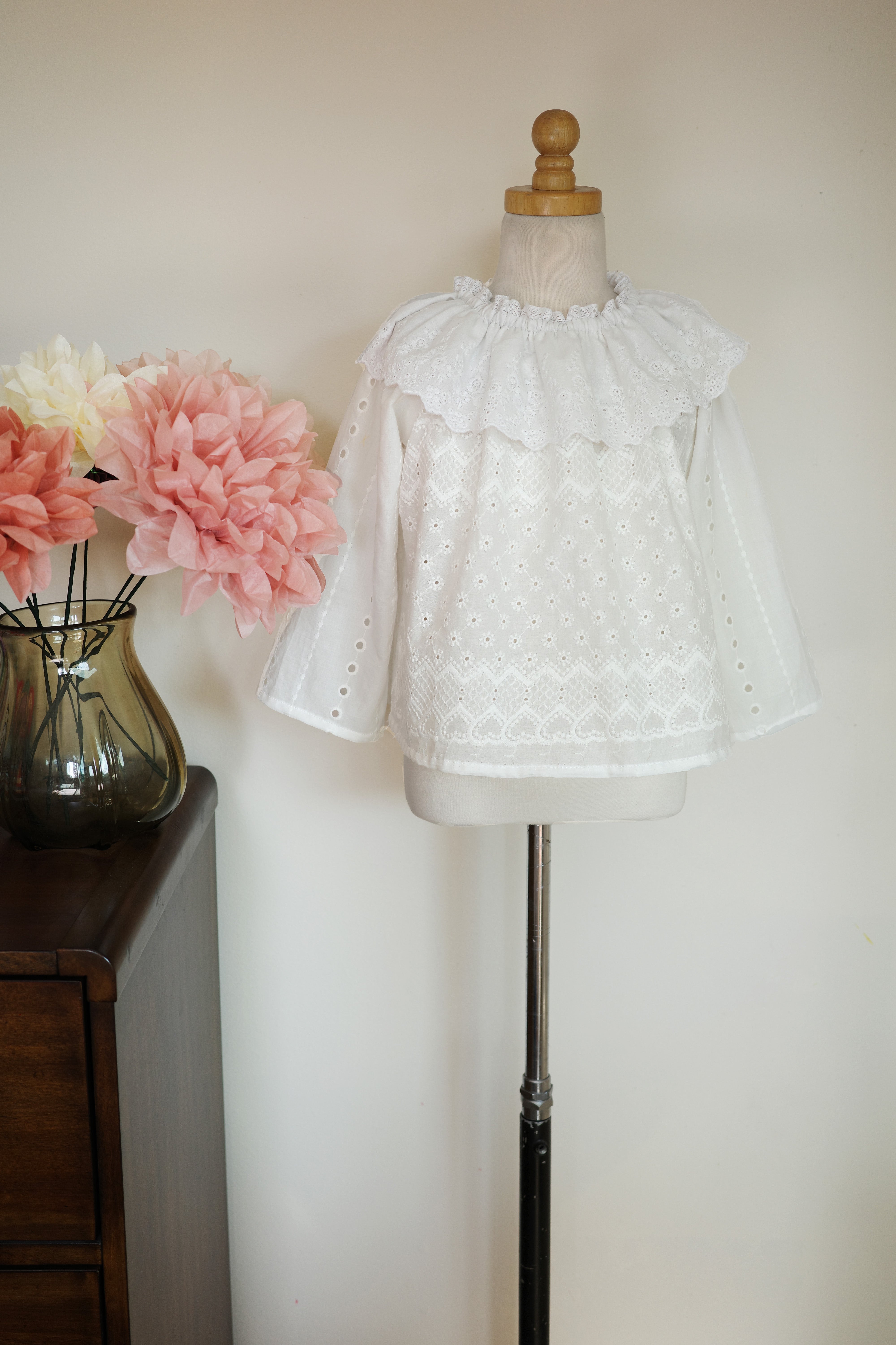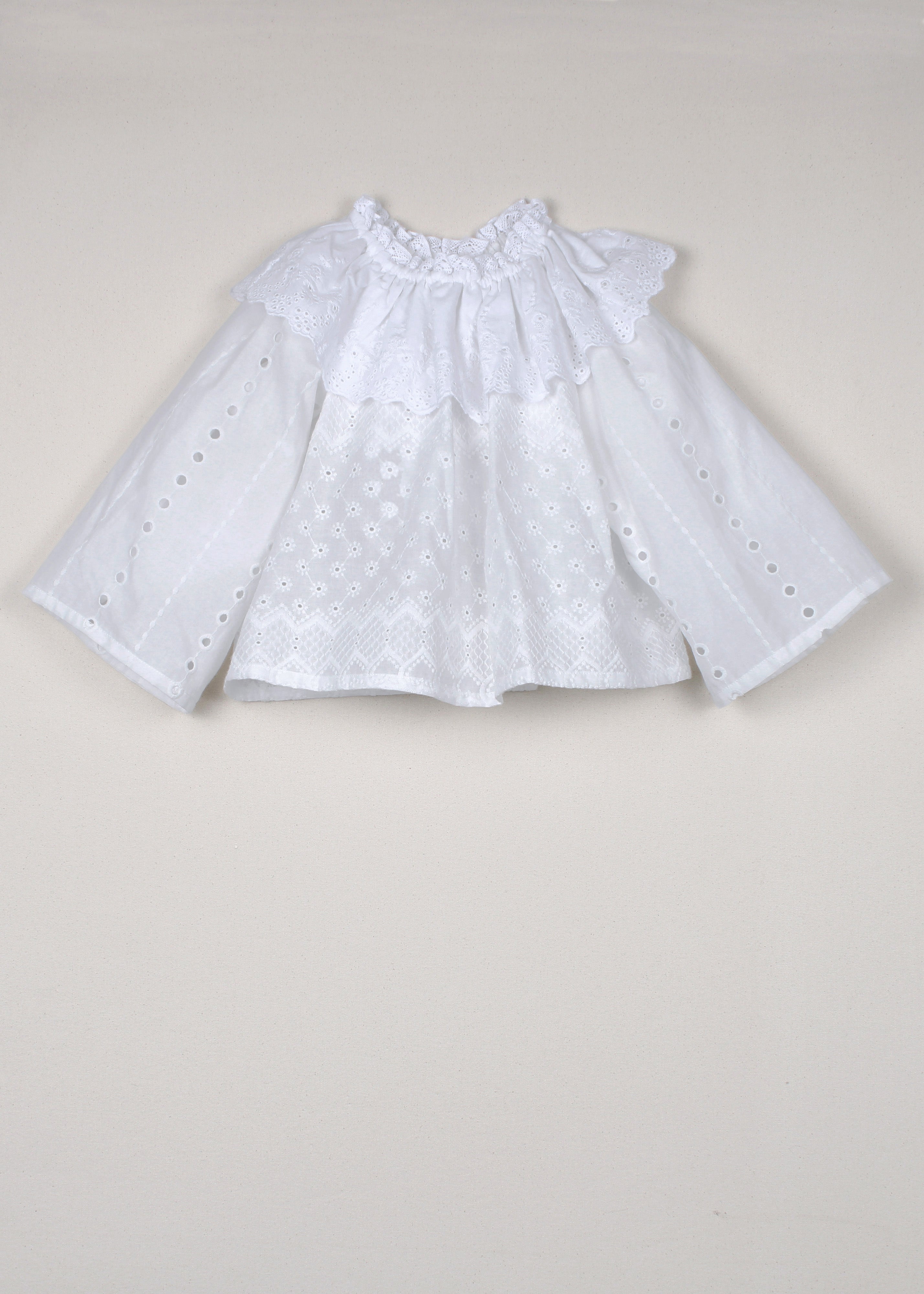 A relaxed everyday blouse, thoughtfully elevated with a delicate blend of eyelet and embroidered fabrics. The heart-patterned embroidery brings a hint of nostalgic charm, while soft elastic at the ruched neckline ensures an easy, comfortable fit. A contrast scalloped lace edge, beautifully embroidered, adds the perfect finishing touch.