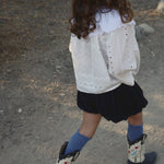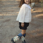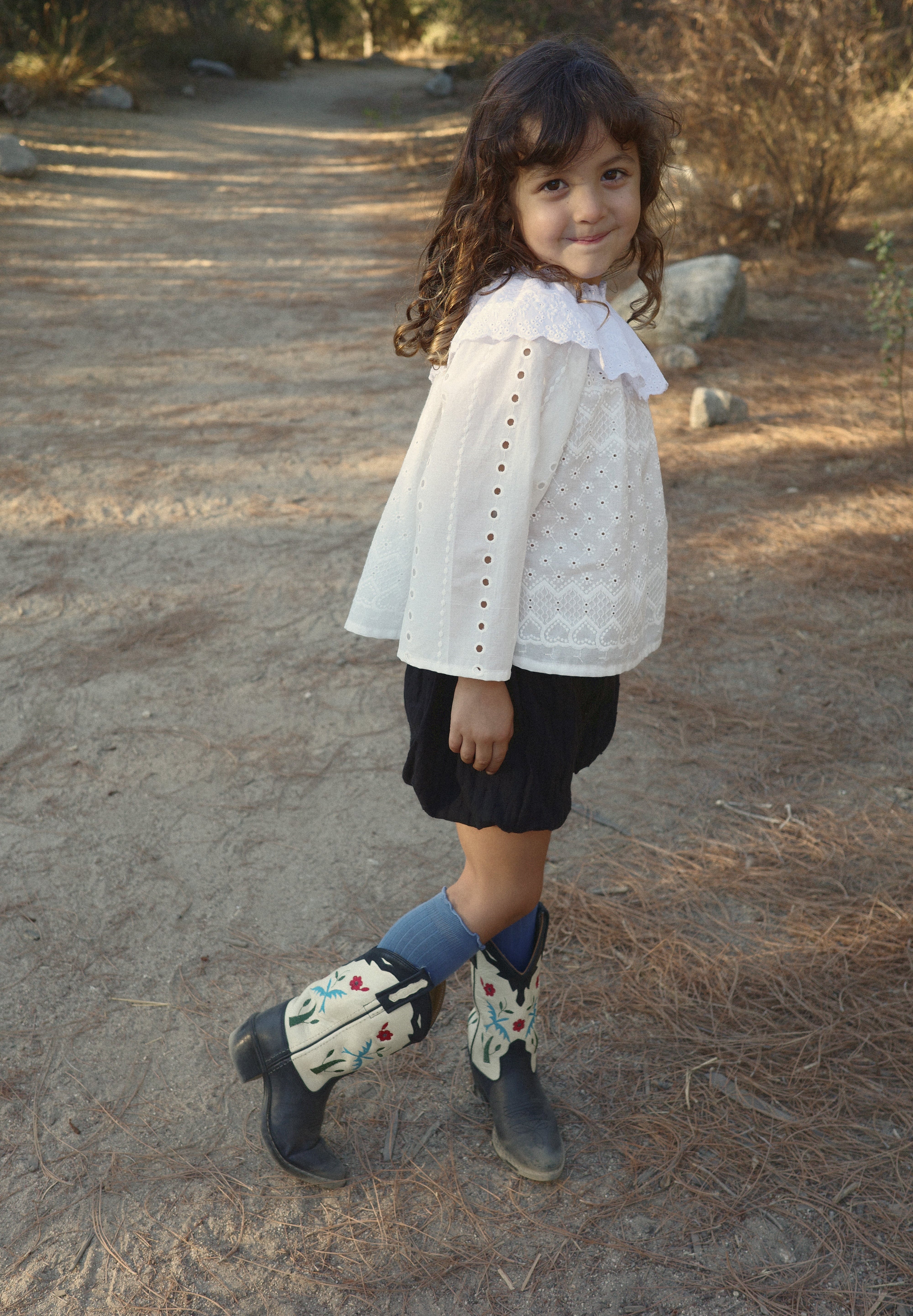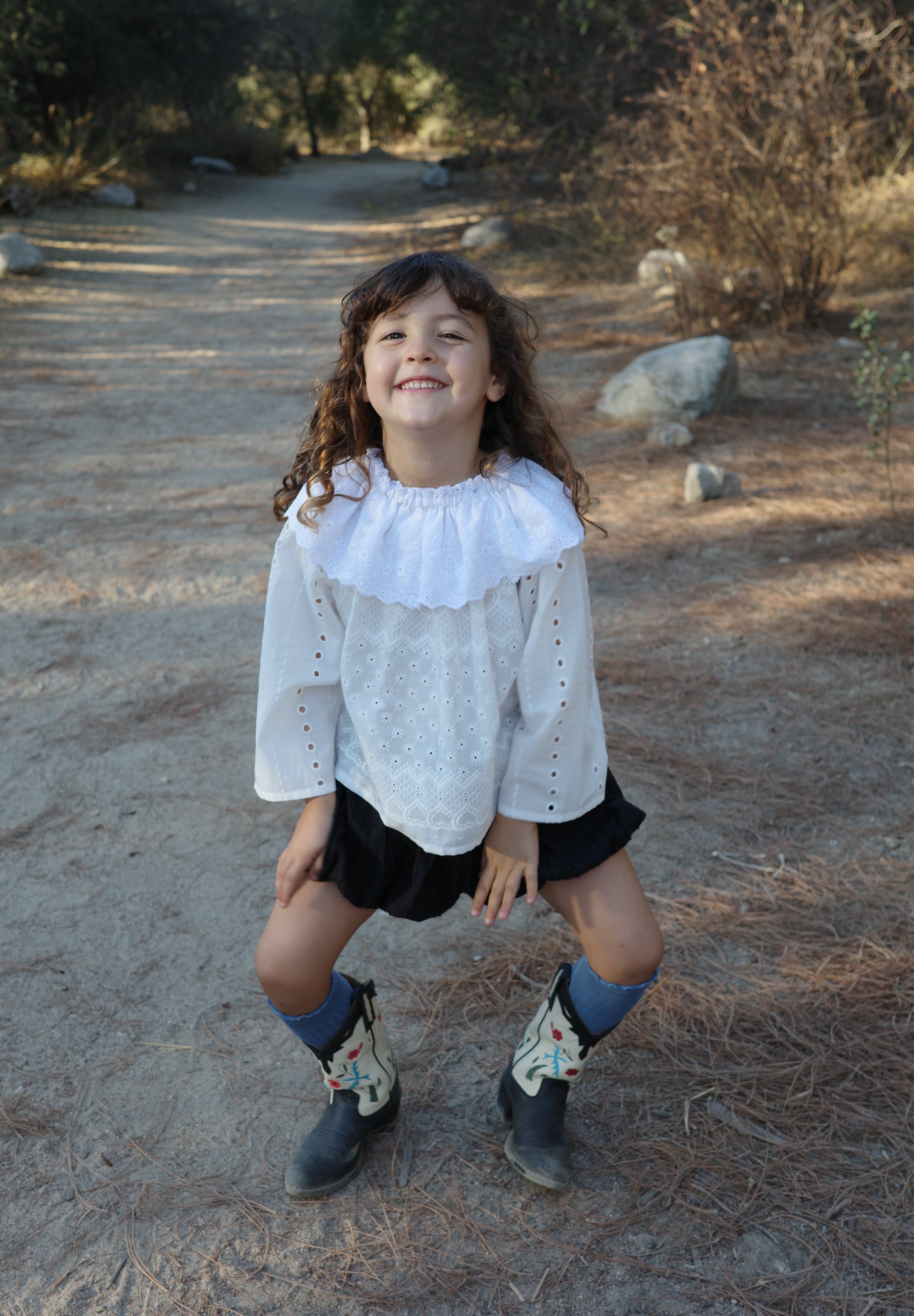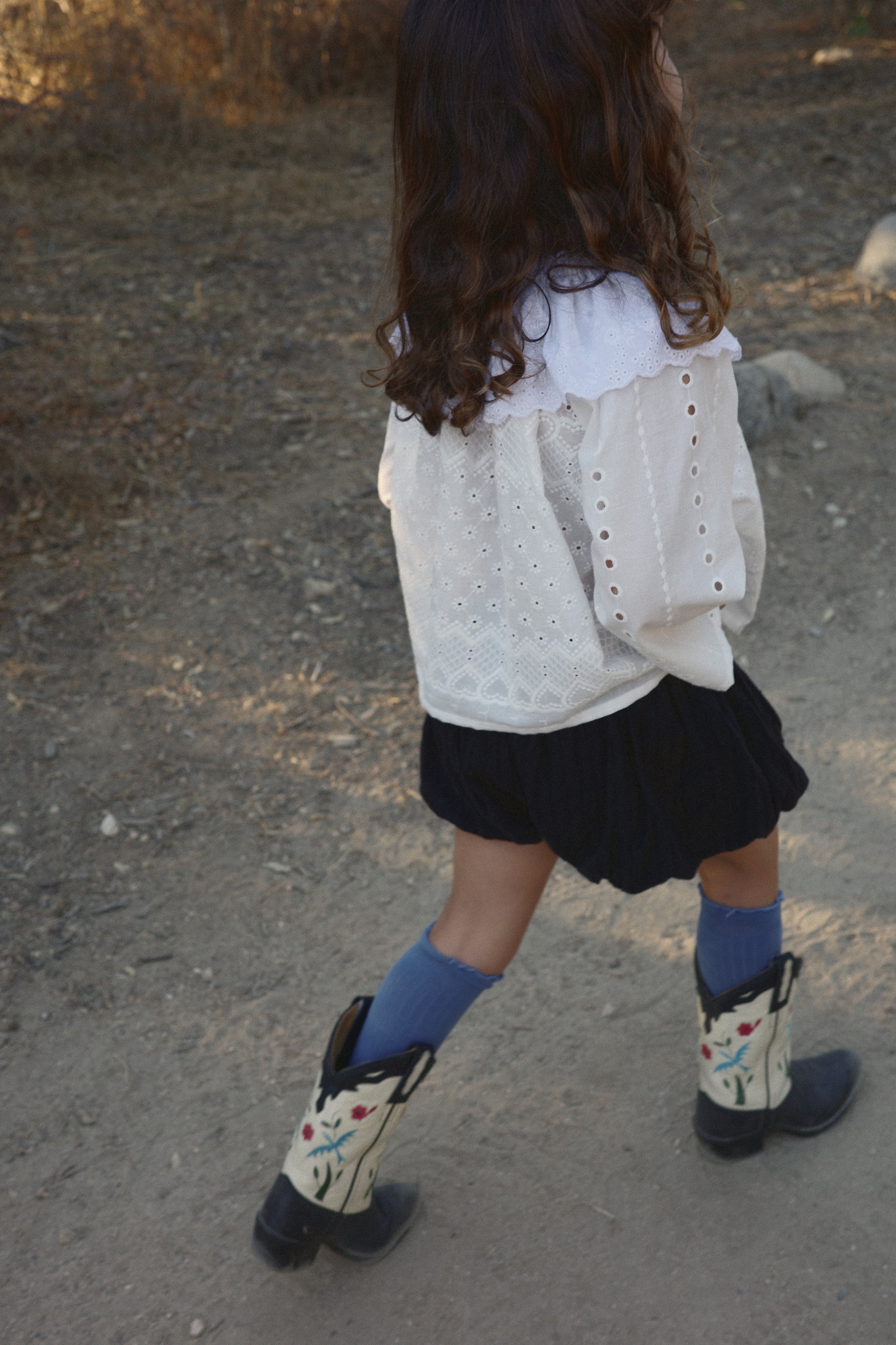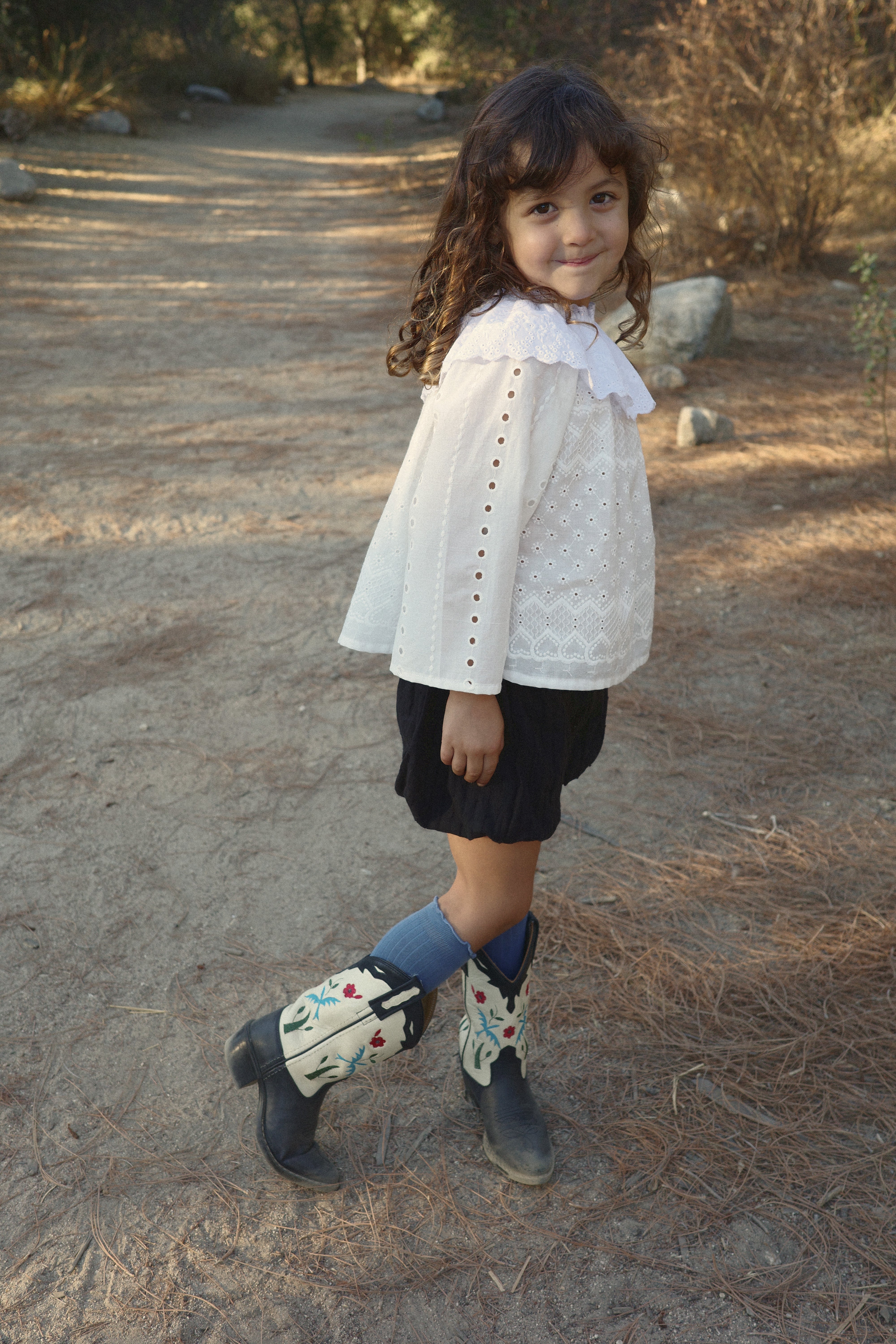 A relaxed everyday blouse, thoughtfully elevated with a delicate blend of eyelet and embroidered fabrics. The heart-patterned embroidery brings a hint of nostalgic charm, while soft elastic at the ruched neckline ensures an easy, comfortable fit. A contrast scalloped lace edge, beautifully embroidered, adds the perfect finishing touch.