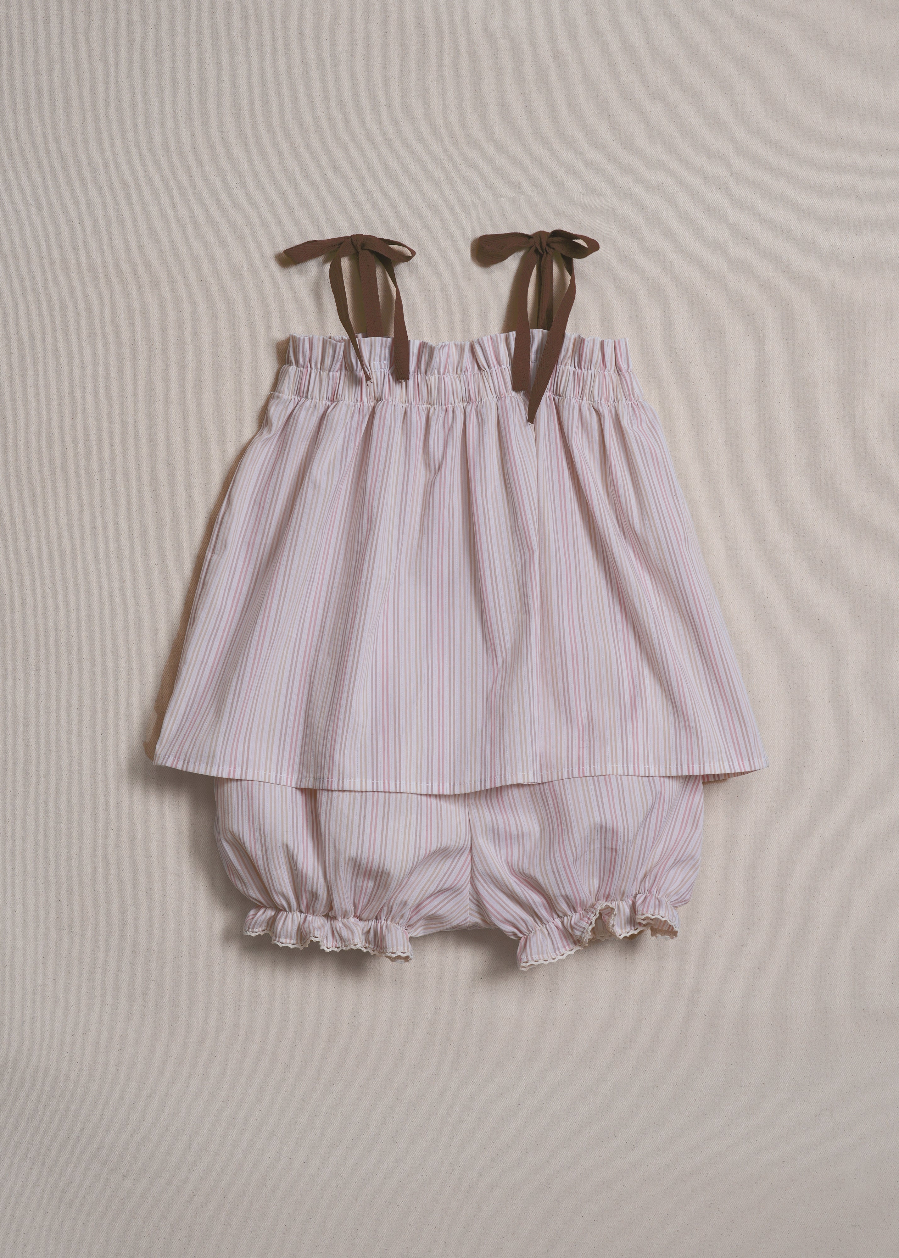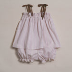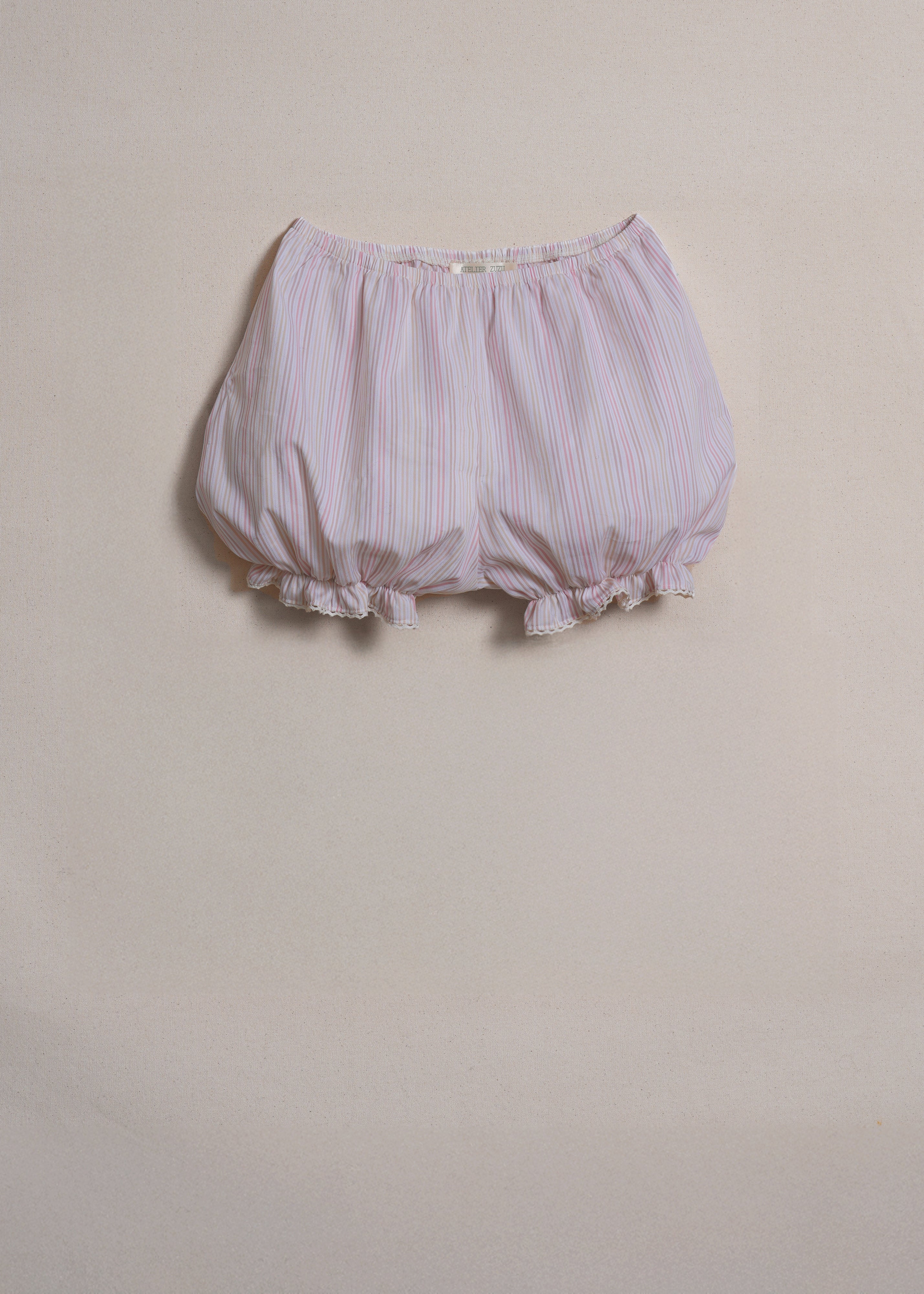 A nostalgic bloomer-style short, updated with a romantic lace-edged ruffle. Crafted from ultra-soft, yarn-dyed cotton in a vintage palette of pink and purple stripes. The elasticized waist and cuffs feature soft knitted elastic for all-day comfort.