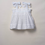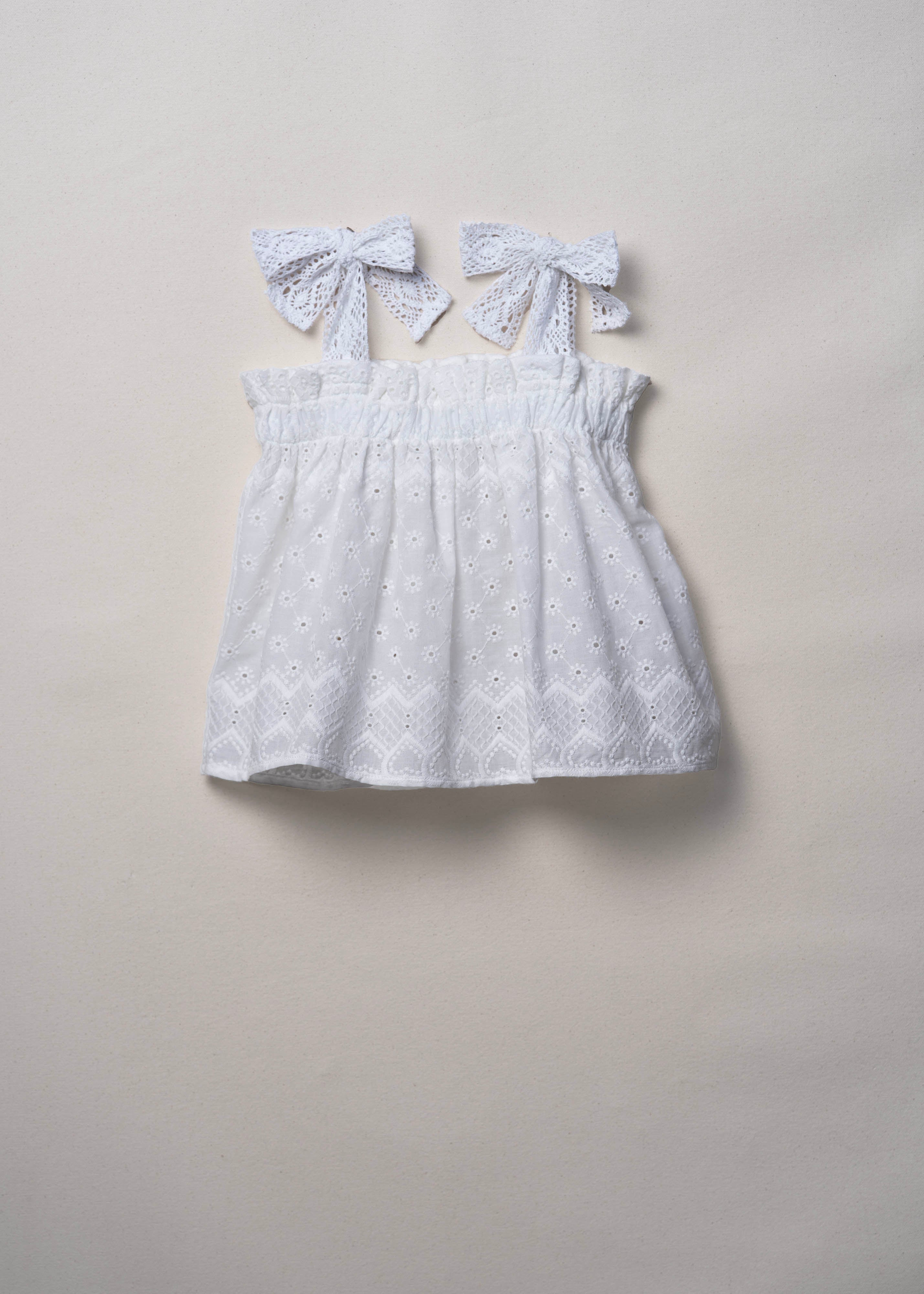 A simple, versatile pop-over top designed to capture the effortless spirit of summer. Finished with soft knitted elastic at the neckline and a delicate ruffled edge. Shoulder ties in a cotton cluny lace offer an adjustable fit. Playful heart shaped pattern on the intricately embroidered eyelet fabric. Unlined.