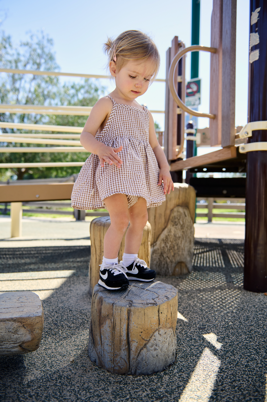 The cutest, lightweight gingham romper perfect for warm summer days complete with a matching hat! Throw a cardigan or denim jacket over when it gets a little chilly ;)