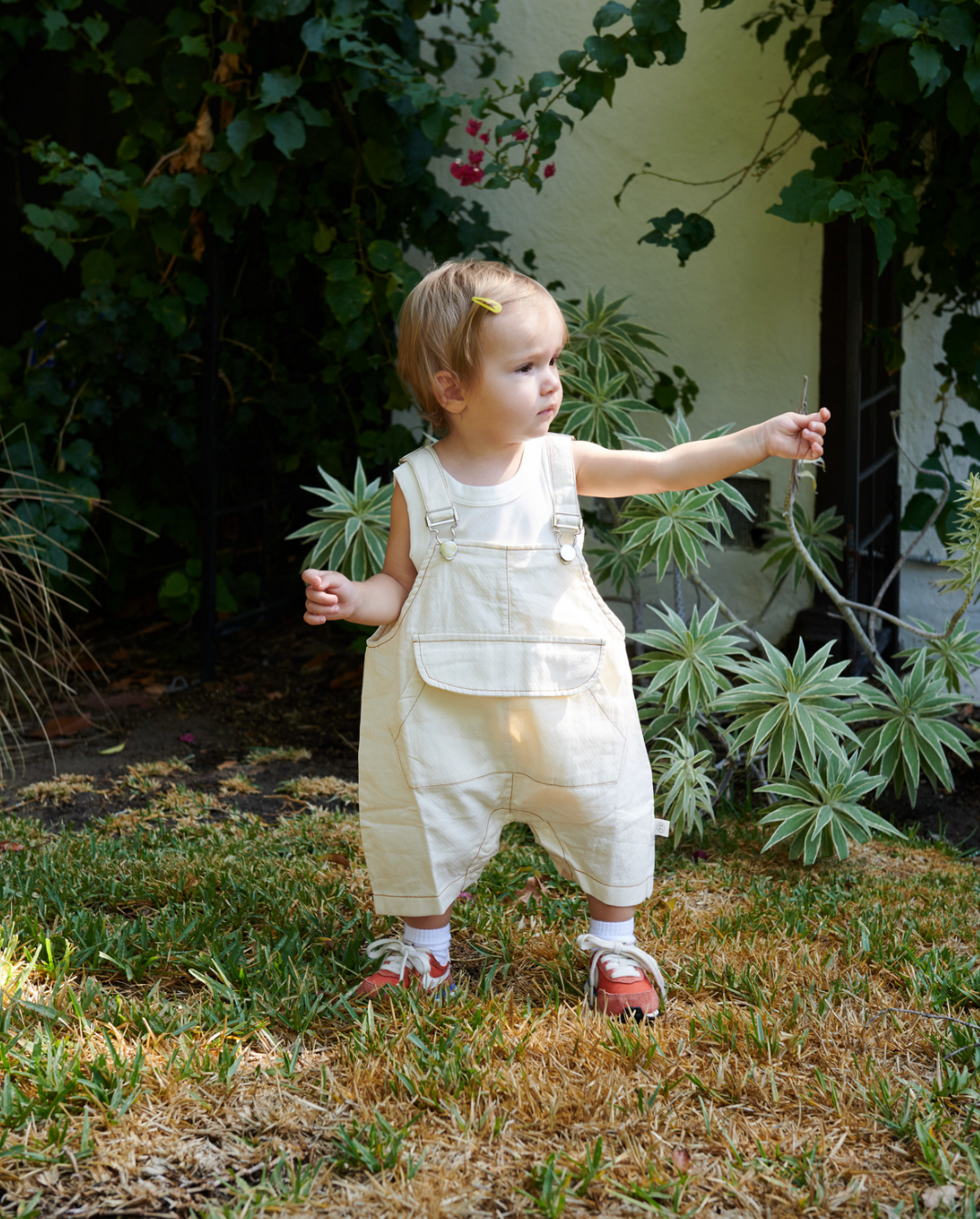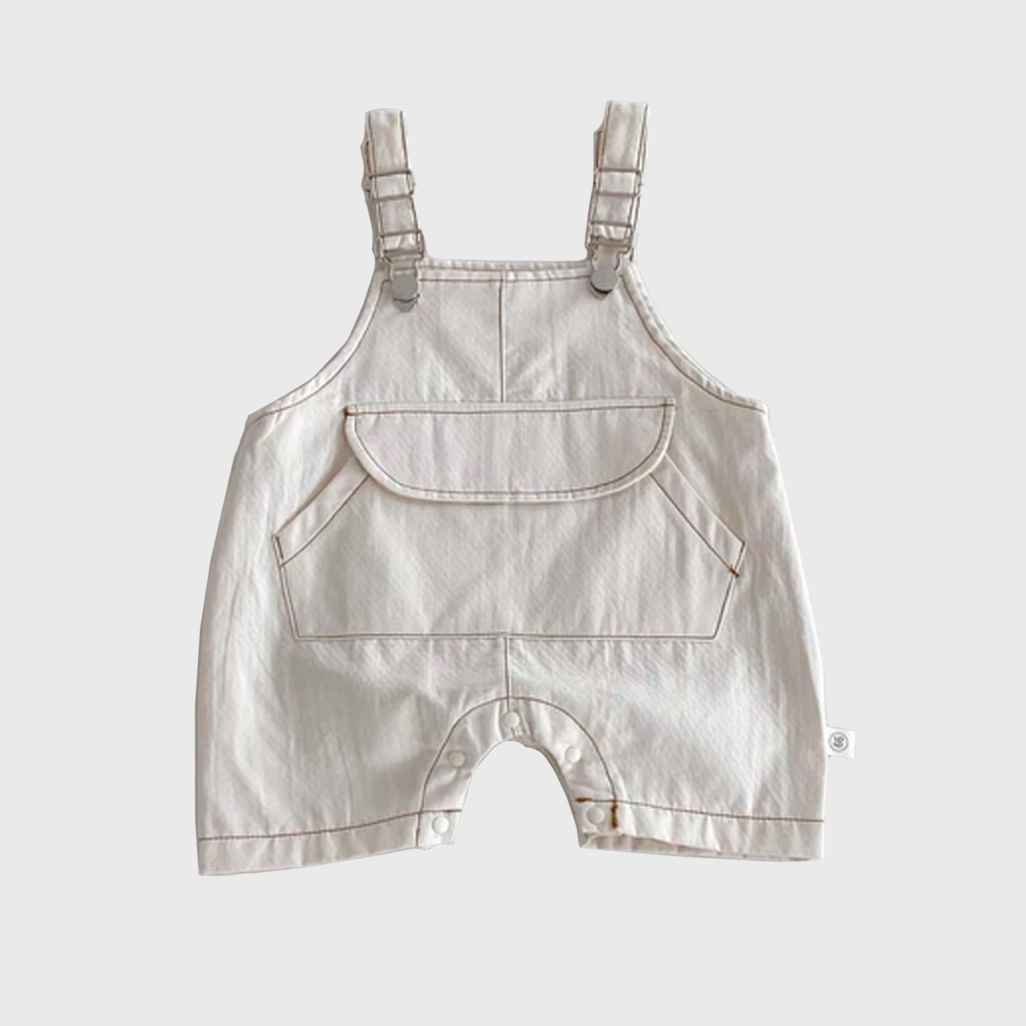 Oversized suspender style overalls in neutral colors for easy pairings. Front flap pocket perfect for all the treasures they find!