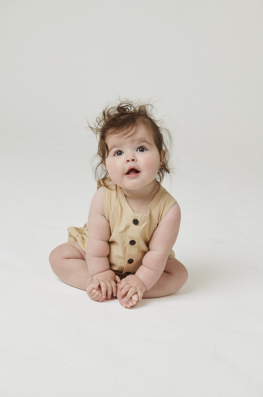 A sleeveless romper featuring a henley-style button front and softly gathered shape. Finished with elastic leg openings and bottom snaps for easy changes.