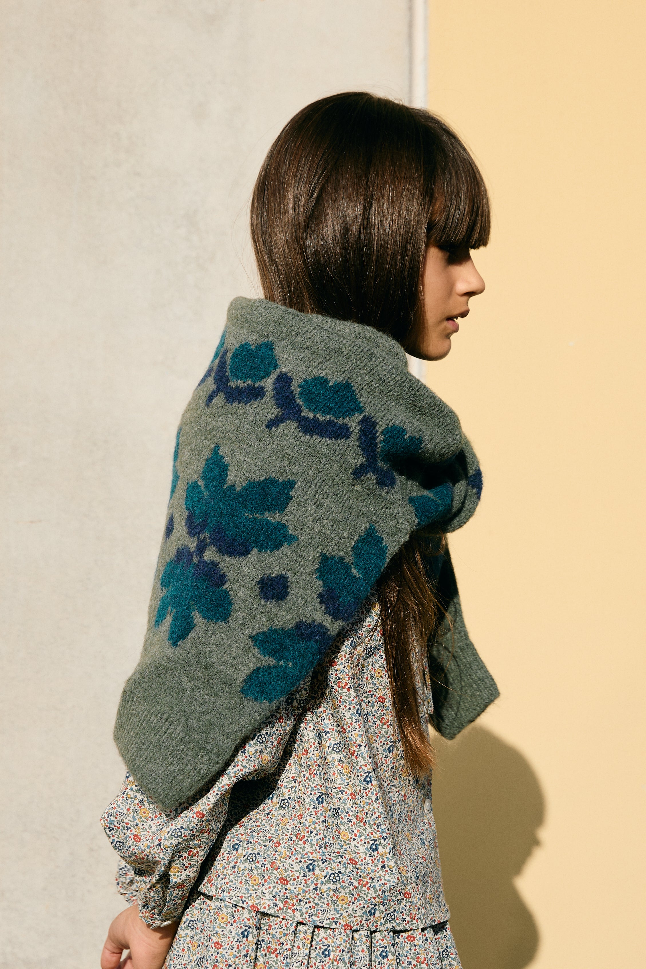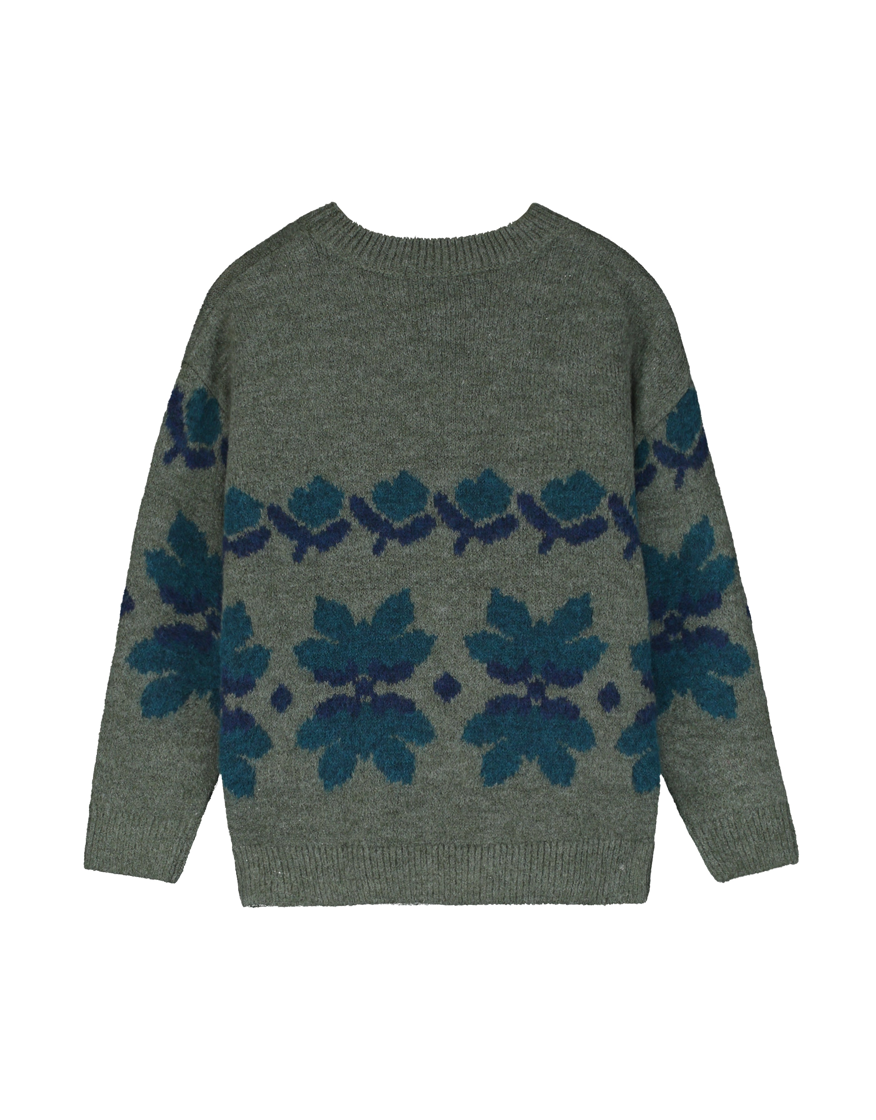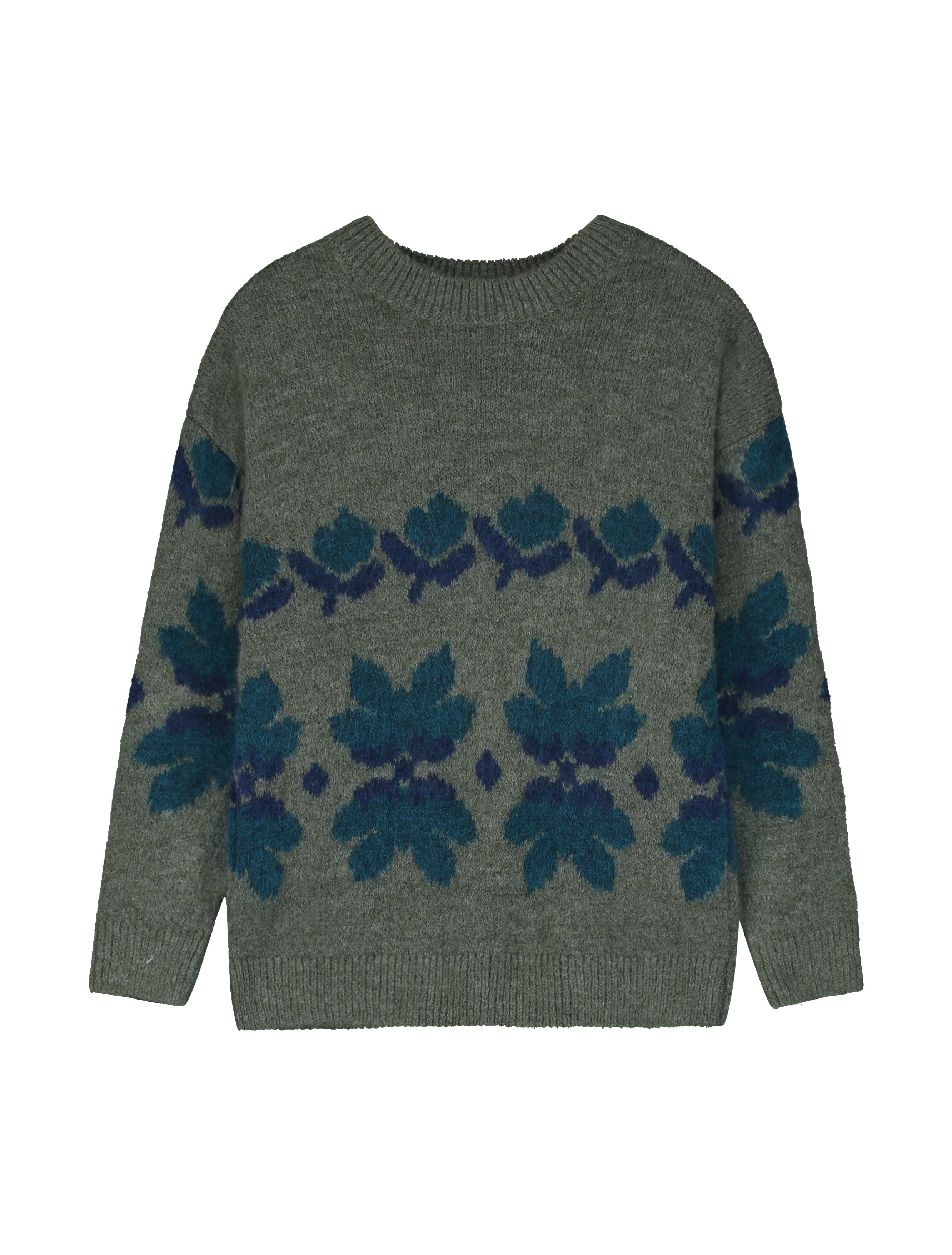 Relaxed fit knitted sweater crafted from wool blend. Embellished with flower motif. Long sleeves and crew neck.