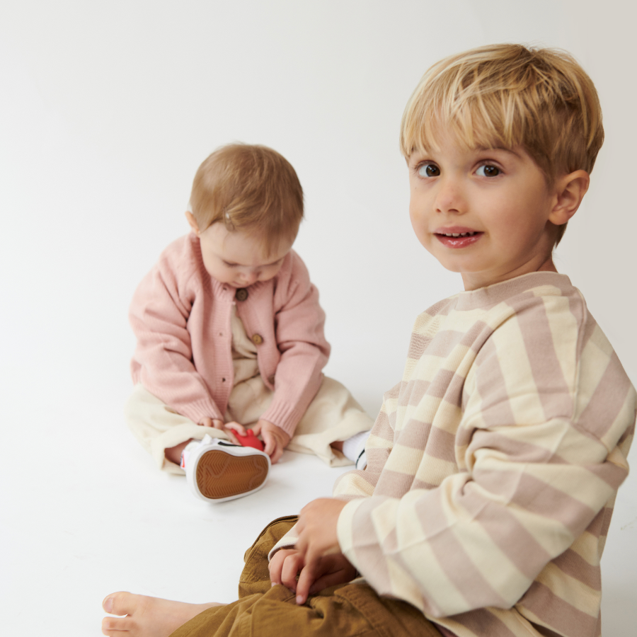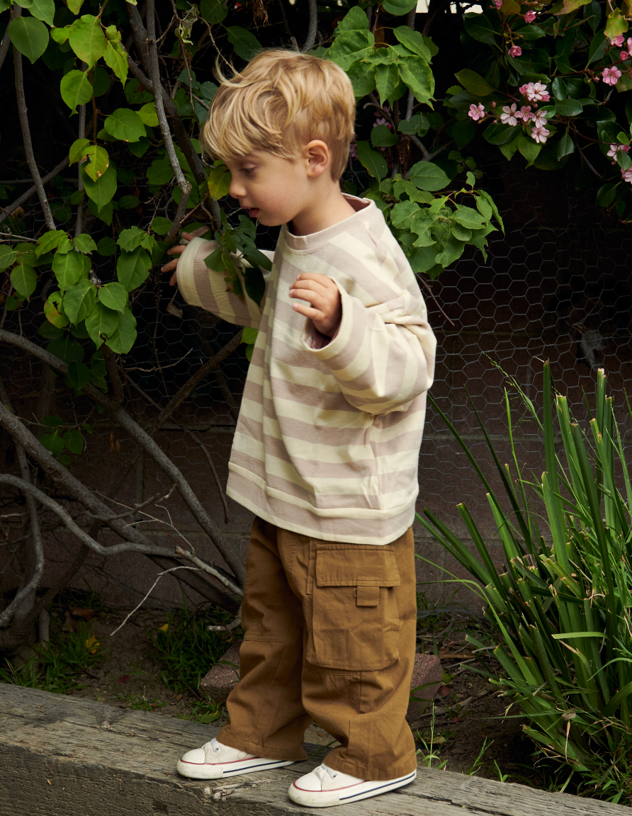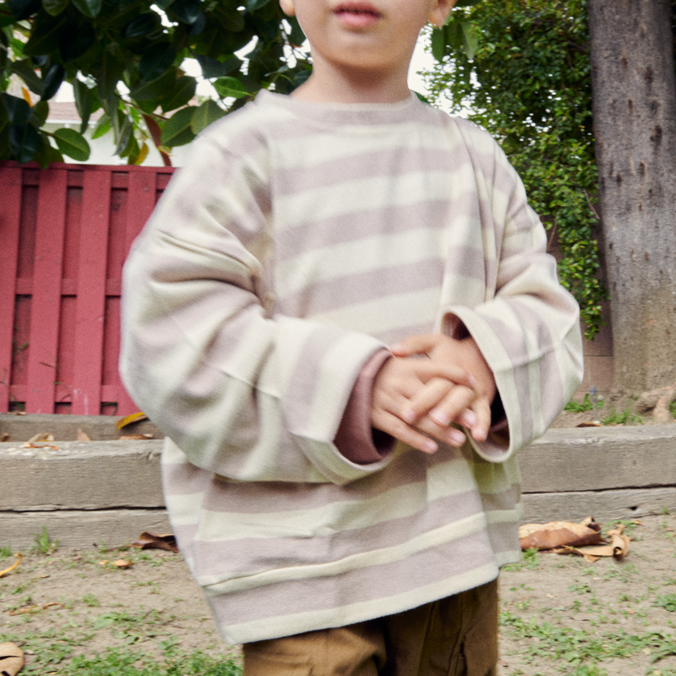 Cotton blend long sleeve stripe knit sweatshirt. Designed for a relaxed fit and finished with a two-button closure and pullover style for ease.