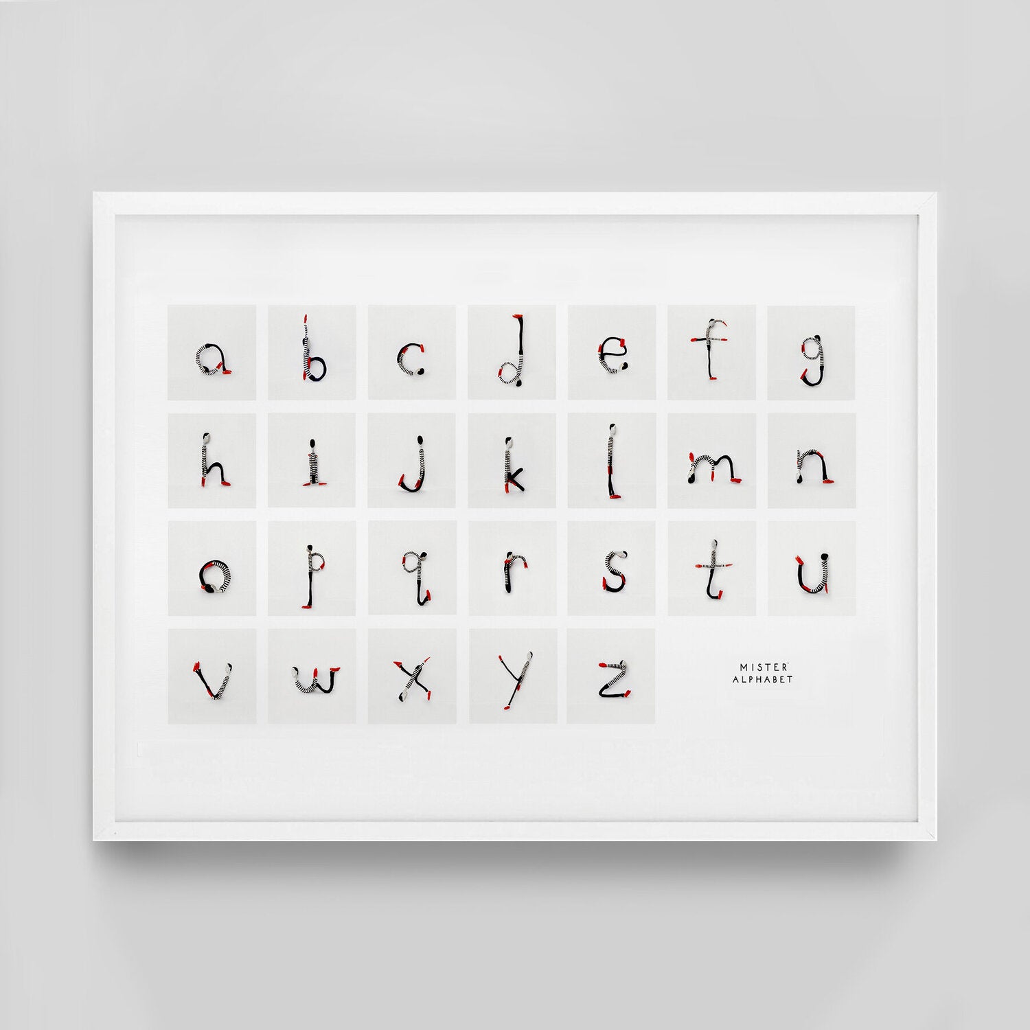 Mister Alphabet Lowercase Print is 16” x 20”, printed in Los Angeles on 100lb matte paper. Fits standard frames for 16 x 20” artwork; Frame not included. Ships rolled.
