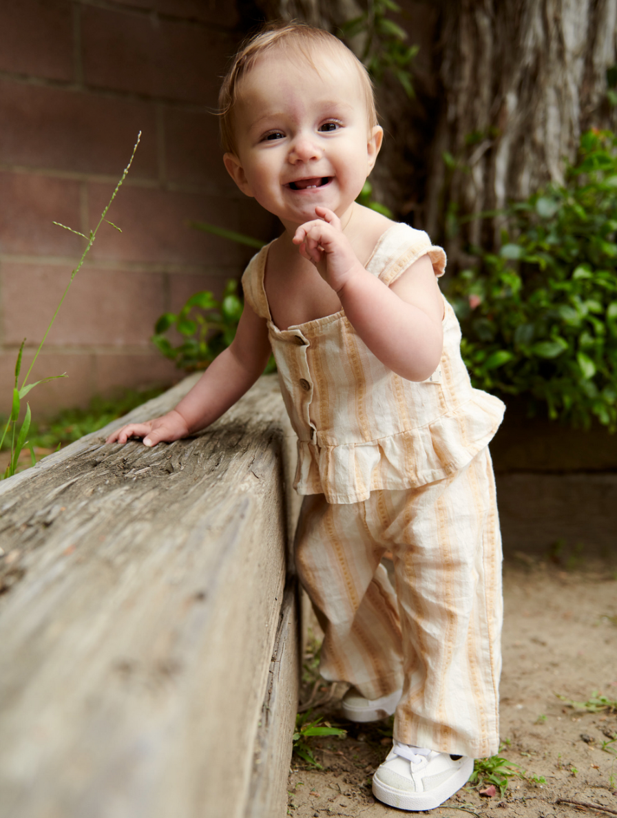 Cotton blend baby tank and pant set. Fabric is lightweight making it perfect for warm summer days. Easy as separates or keep it together for a matching look. Pair with our Margot cardigan when it gets a little breezy. Choose between a stripe or plaid pattern… if you can!
