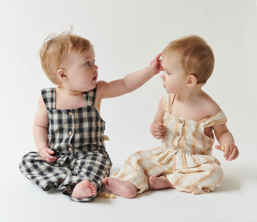Model in stripe is 8 months old and wearing size 6-12M. Model in plaid is 8 months old and wearing size 12-18M.