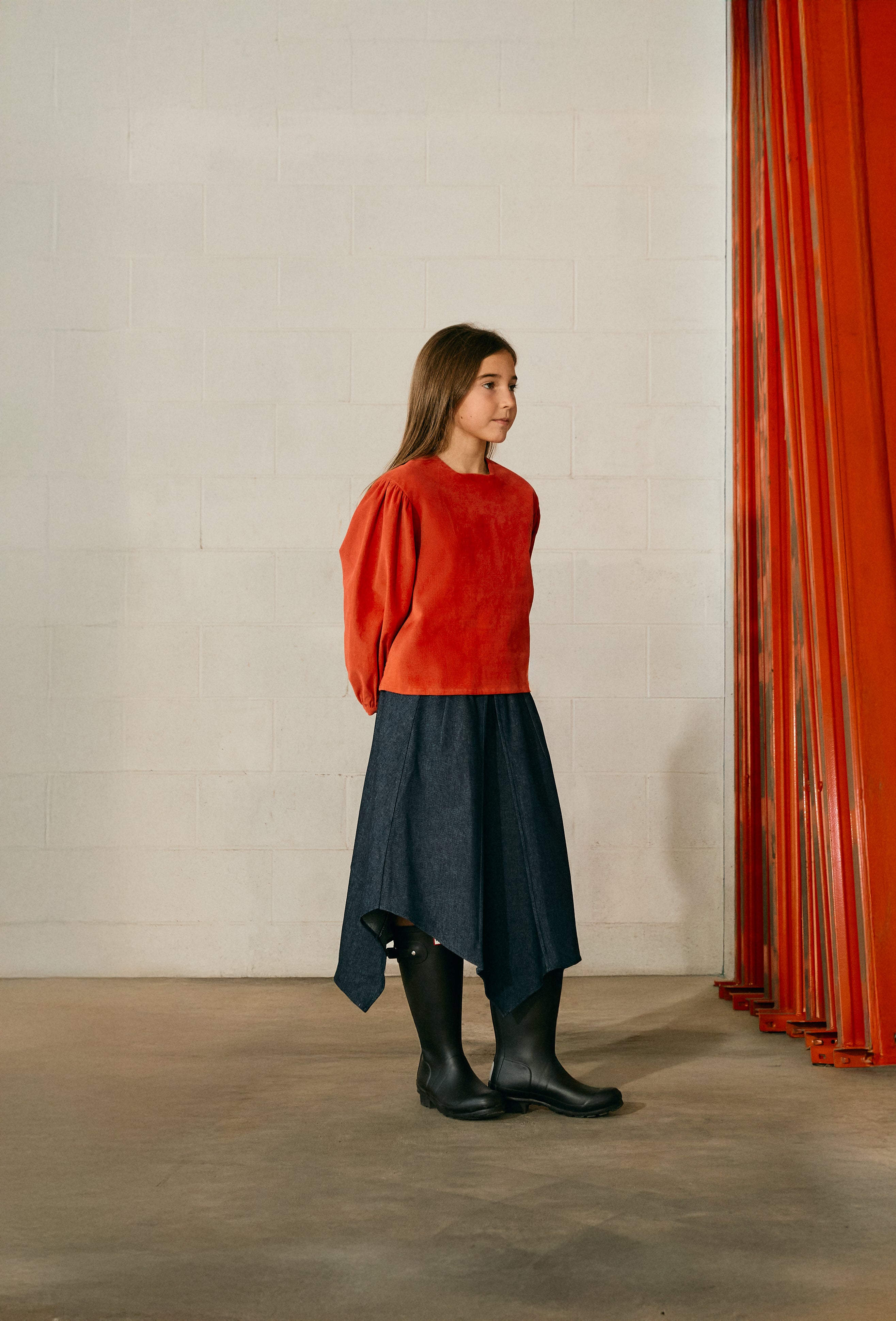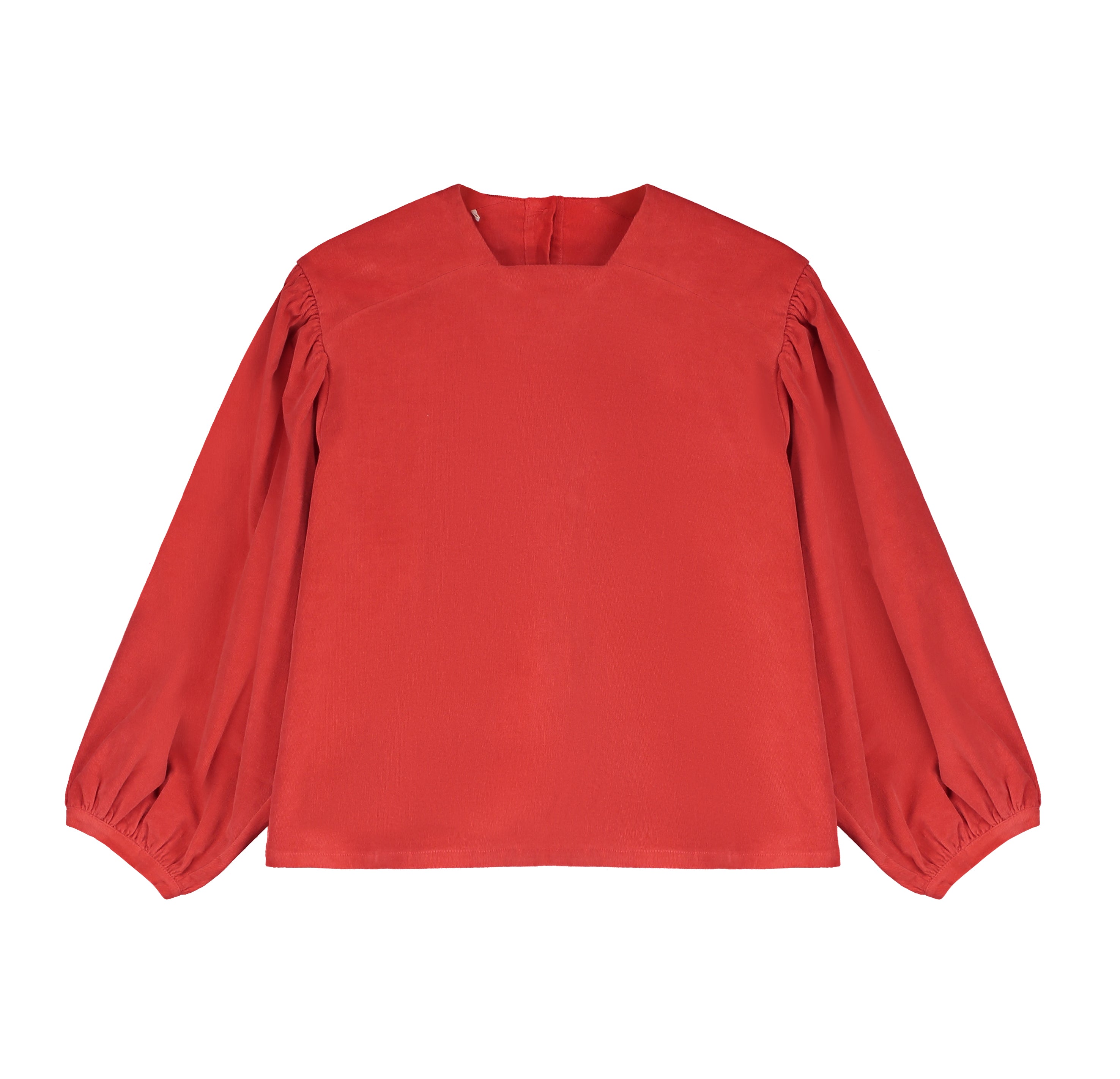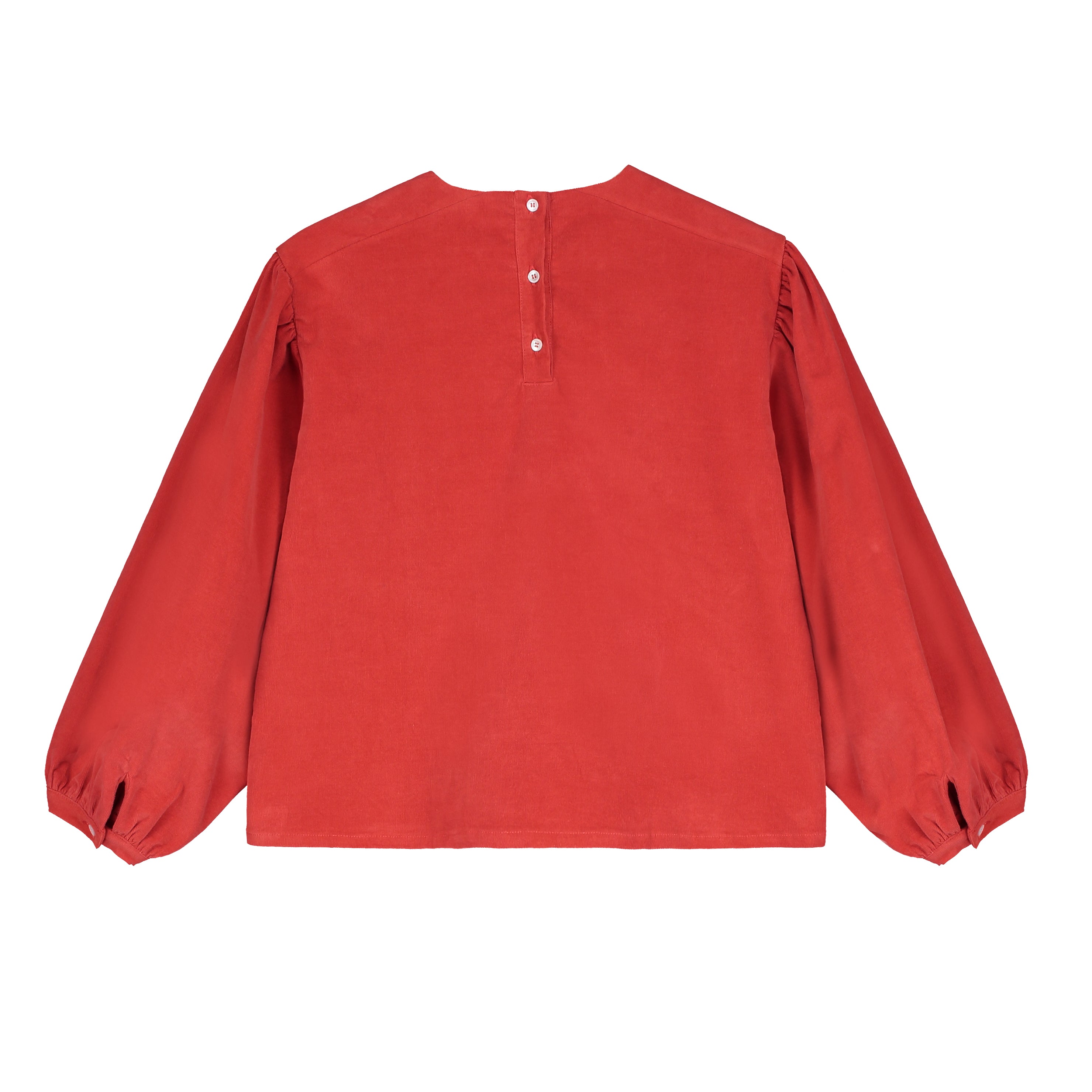 Square neck blouse made from corduroy. Relaxed fit styled with symmetrical cuts with voluminous sleeves. Back button closure and button cuffs. Weave-dyed.