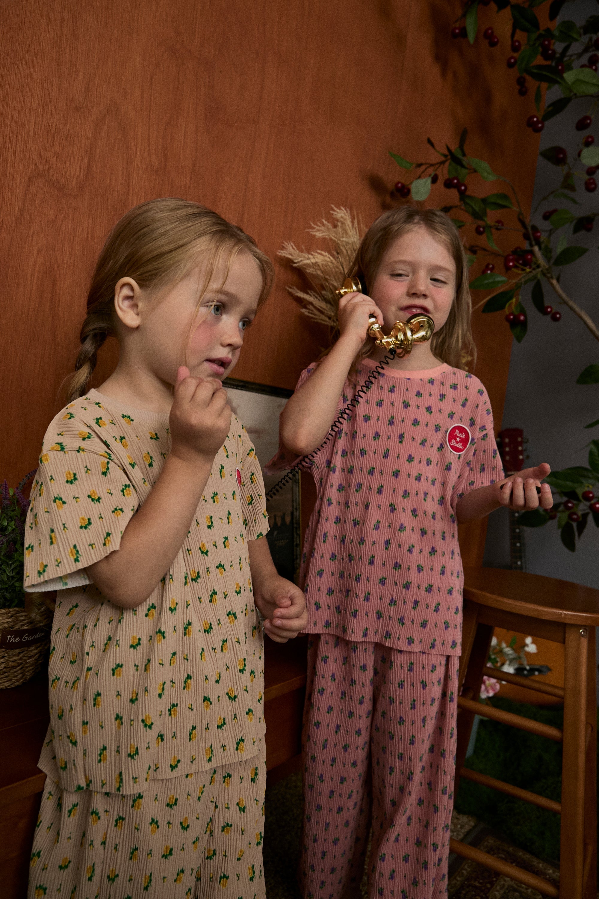 Our Floral Pleats Top features a lightweight pleated texture and a tiny all over floral print that feels fresh and timeless The relaxed silhouette drapes beautifully and moves with every step making it perfect for warm weather play Pair it with the matching pants or style it with denim shorts for an easy everyday look.