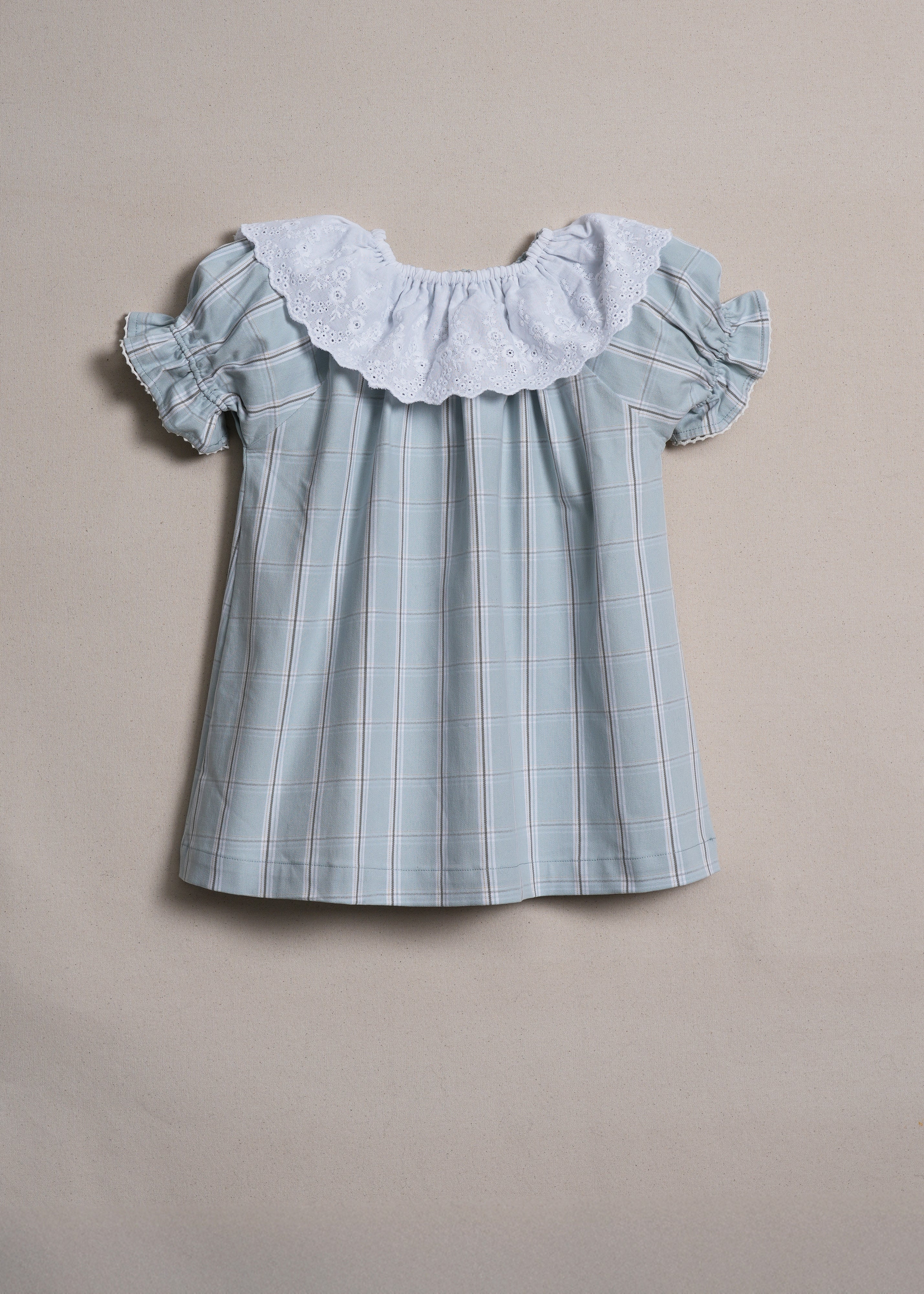Our signature Ines Dress is reimagined in a vintage-inspired check, crafted from stretch cotton twill for a comfy yet structured feel. Nostalgic charm shines through in every detail—from the contrast fabric pockets trimmed with sweet lace edging to the Victorian-inspired ruffled neckline, delicately scalloped and embroidered. Designed for ease and comfort with a pull-over fit and gentle elastic at the neckline and sleeves, the Azul Dress is a timeless treasure—ready to be worn, loved, and passed down.