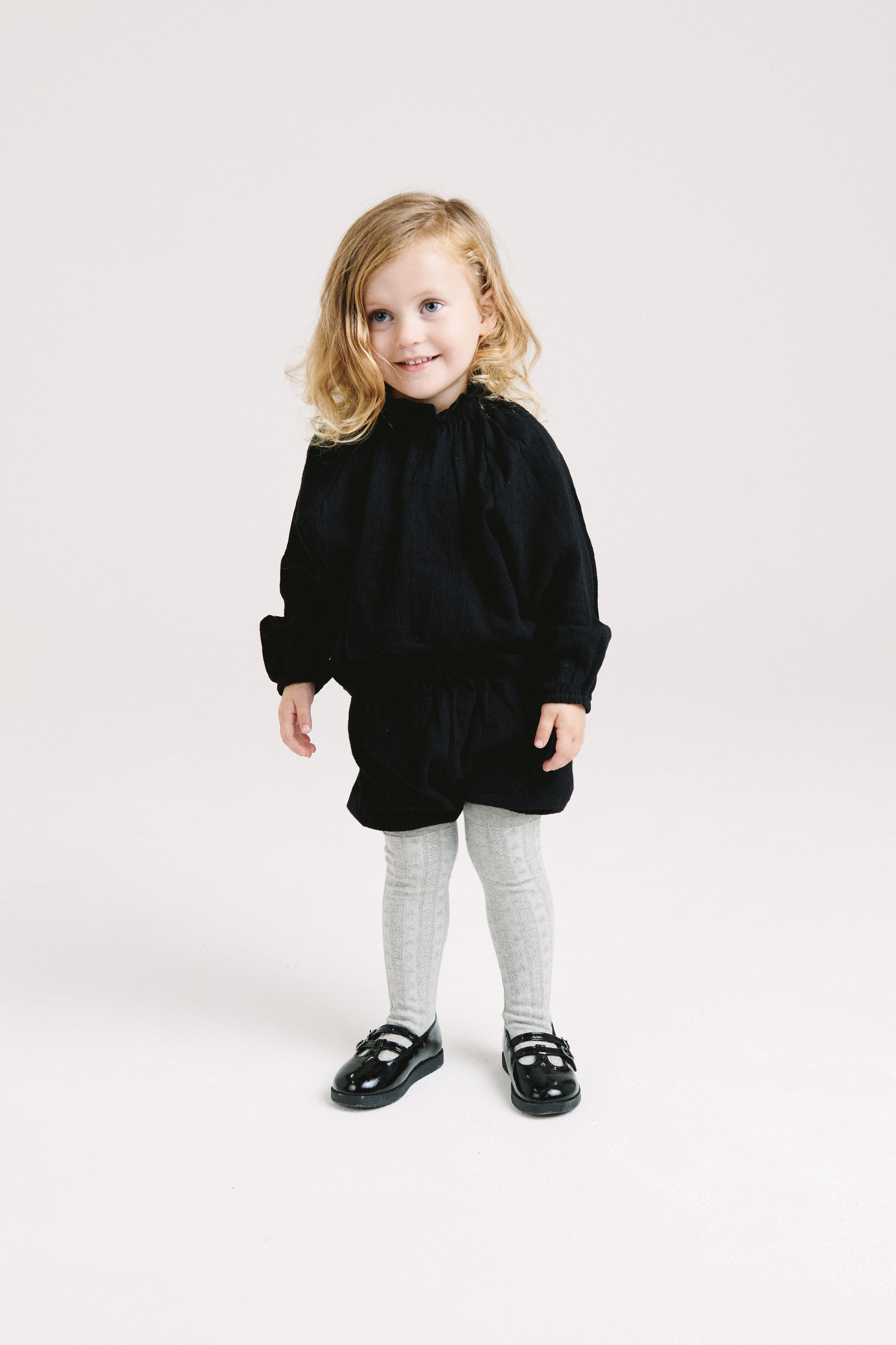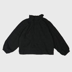 Lightweight cotton blend blouse with ruffle detail on neck and elastic hemlines. Wear casual with jeans or dress it up with a skirt. Or pair with the matching bloomers!